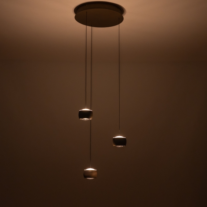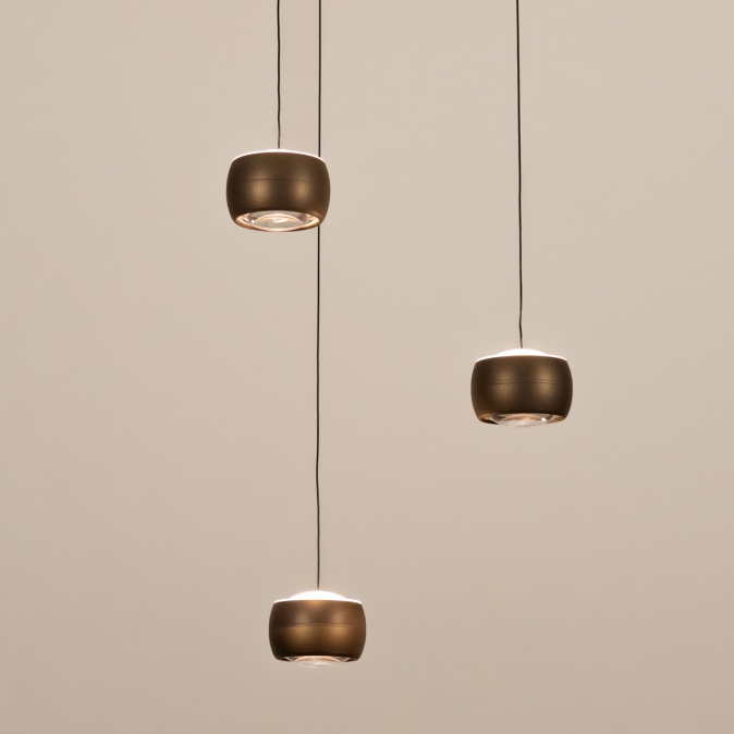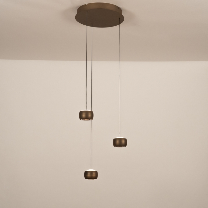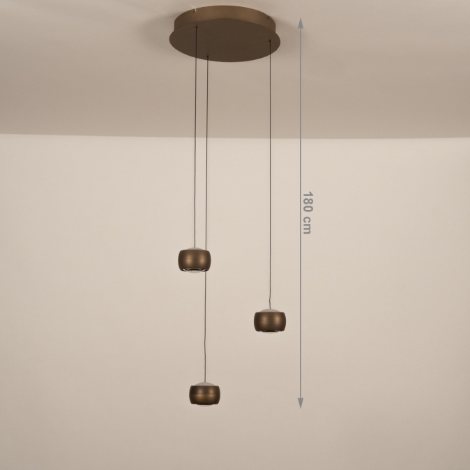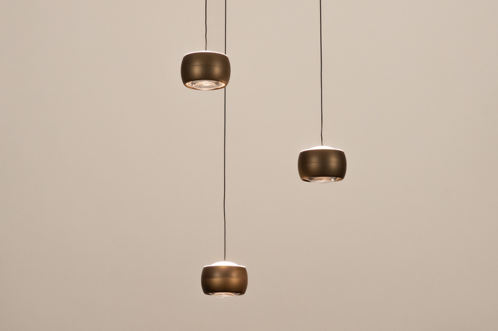 Brons kleurige hanglamp, voorzien van drie lichtpunten, een easy lift systeem en een dim to warm functie
