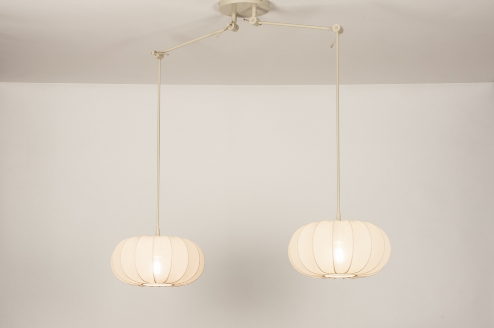Twee lampion lampen boven de eettafel aan één plafondplaat, zonder storende snoeren of kabelgootjes op het plafond? Deze knikarm lamp voor aan het plafond is de oplossing! Zelfs als het lichtpunt niet recht boven de eettafel zit. De verstelbare dubbele hanglamp in beige bestaat uit meerdere delen. Hierdoor is de beige hanglamp draaibaar en verstelbaar.Handig, maar ook mooi. Een combinatie waar we van houden. Belangrijk voor een mooie vormgeving van dit type lamp, is de juiste verhouding van de twee armen. Dit is bij onze lamp optimaal! De lengte van de korte arm/stang is 30 cm. De lengte van de lange arm/stang is 70 cm. De lampion kappen zijn gemaakt van een mooie beige stof die transparant is en een streep-structuur heeft. De tulband vorm, de lampion belijning en de mooie stof maken de kappen zacht en rustiek. Een prachtige hanglamp voor in een japandi interieur, Scandinavische inrichting, maar ook in een landelijke woonstijl of boho interieur straalt deze lampion hanglamp als geen ander.Voordelen beige verstelbare hanglamp