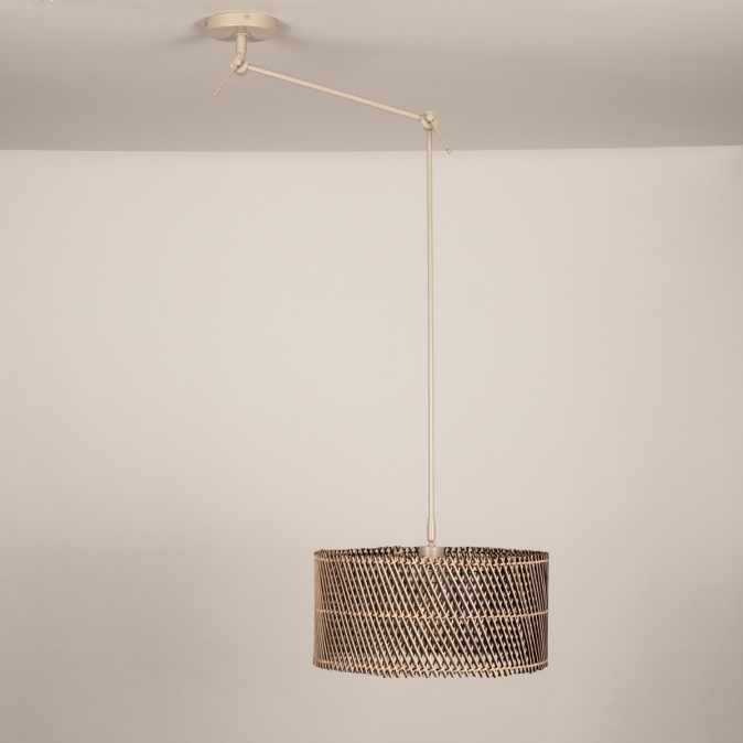 Breng rust en warmte in je interieur met deze beige verstelbare knikarm hanglamp, gecombineerd met een stijlvolle bamboe kap in zwart en naturel. De ronde kap, open aan de boven- en onderkant, heeft een strak en modern ontwerp dat de natuurlijke schoonheid van bamboe benadrukt. Samen met de subtiele beige knikarm ontstaat een lichte, verfijnde uitstraling die perfect past in een harmonieus interieur. Dankzij de verstelbare knikarm is de lamp uiterst flexibel, zodat je het licht precies kunt richten waar het nodig is. Of je nu een rustige leeshoek wilt creëren, je eettafel sfeervol wilt verlichten of een statement wilt maken in je woonkamer – deze lamp doet het allemaal met stijl. De beige tint van de arm sluit prachtig aan bij natuurlijke en warme interieurstijlen, zoals Japandi, Scandinavisch of rustiek-modern.Voordelen van deze verstelbare hanglamp in beige