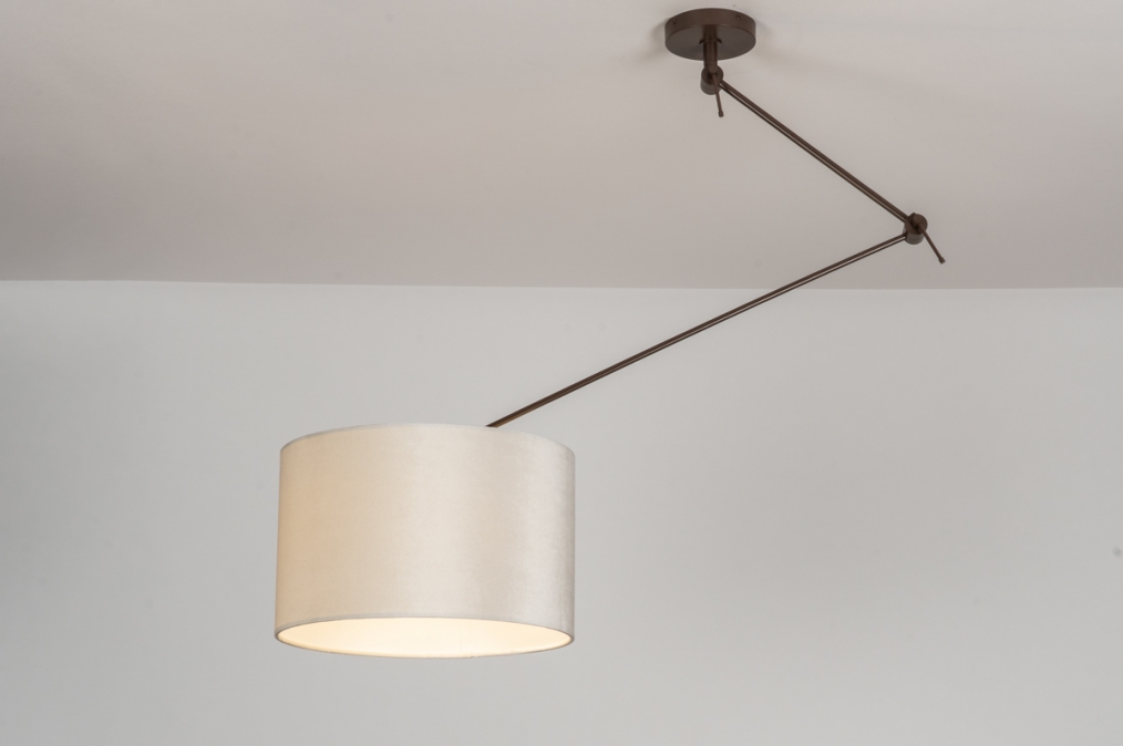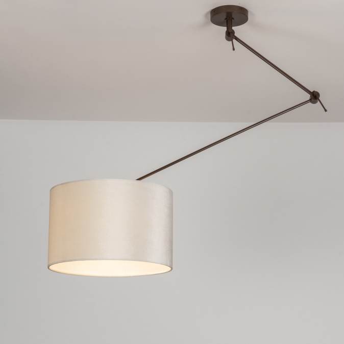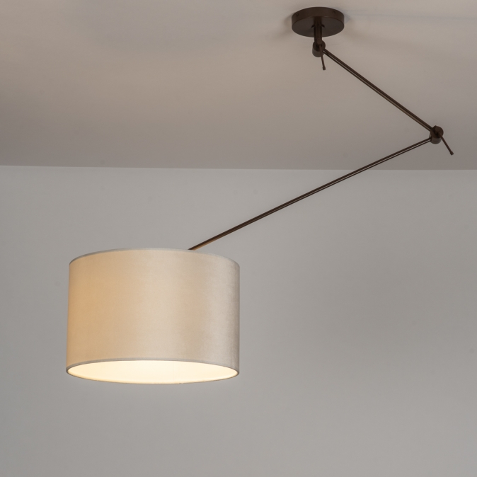 Pendellamp met warme beige fluwelen kap en XL zwenkarm, flexibel en stijlvol!