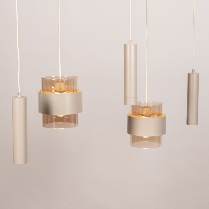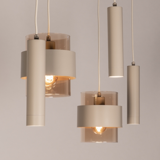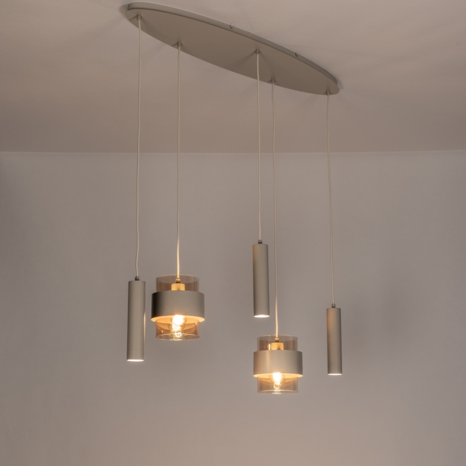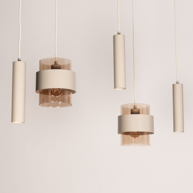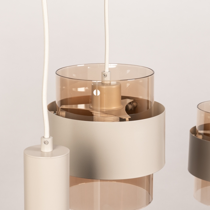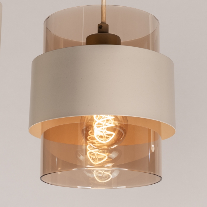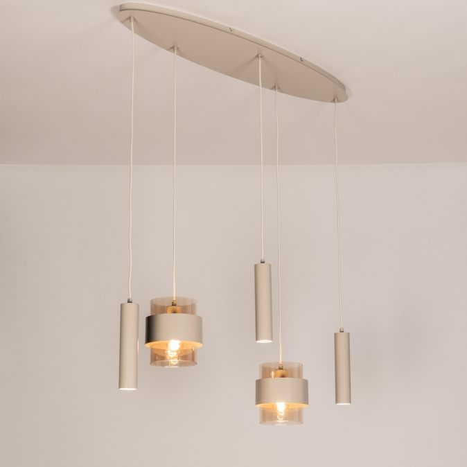 Deze beige hanglamp is voorzien van vijf lichtpunten aan een fraaie, ovale plafondplaat; twee glazen kappen en drie lichtkokers met daarin een spot. Elke glazen kap is uitgevoerd in amberkleurig glas, gecombineerd met beige details. De drie kokers zijn volledig uitgevoerd in de beige kleur en de spots liggen wat dieper verzonken. De spots geven een prachtige verlichting op de tafel of het werkblad terwijl de twee glazen juist het licht sfeervol rondom uitstralen. Een geweldige combinatie van zowel functioneel als sfeervol licht! De glazen zijn uitgevoerd in amberkleurig glas. Amberkleurig glas heeft een geel / bruine tint maar is toch transparant en zorgt voor sfeervol licht. Over de mooie, glazen kokers is een beige, matte ring geplaatst.Voordelen beige hanglamp van glas