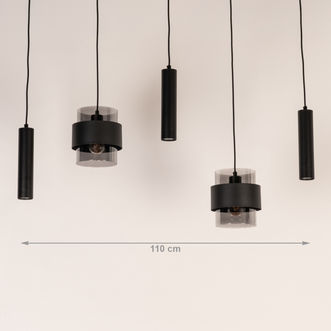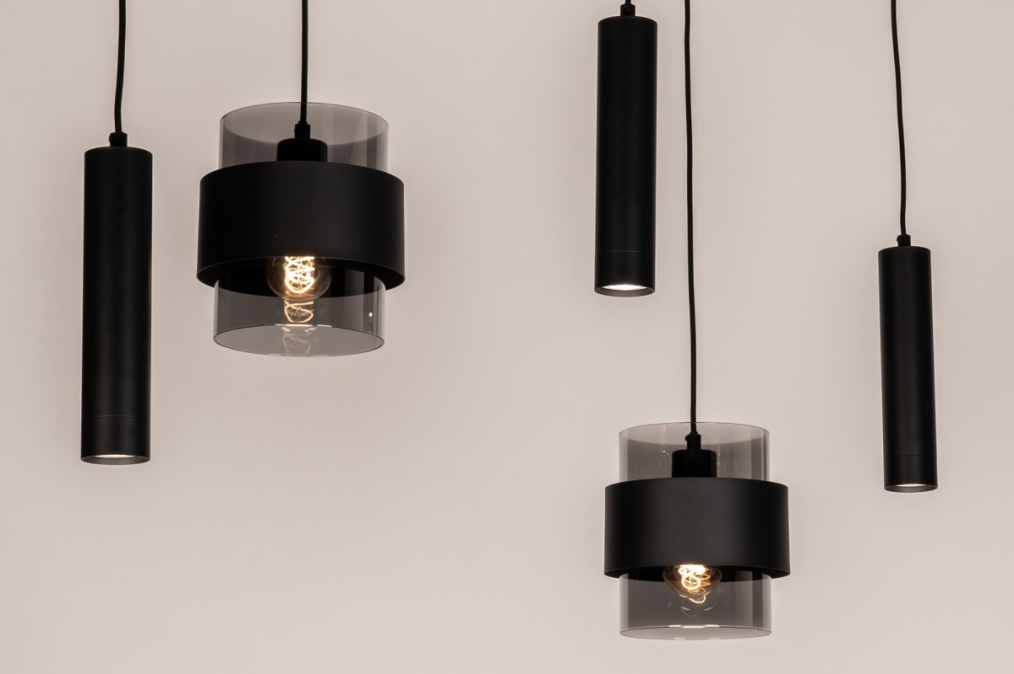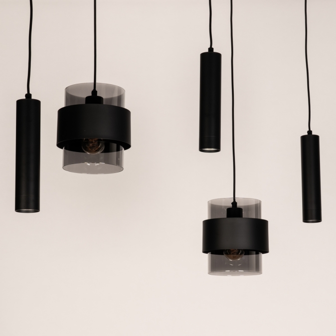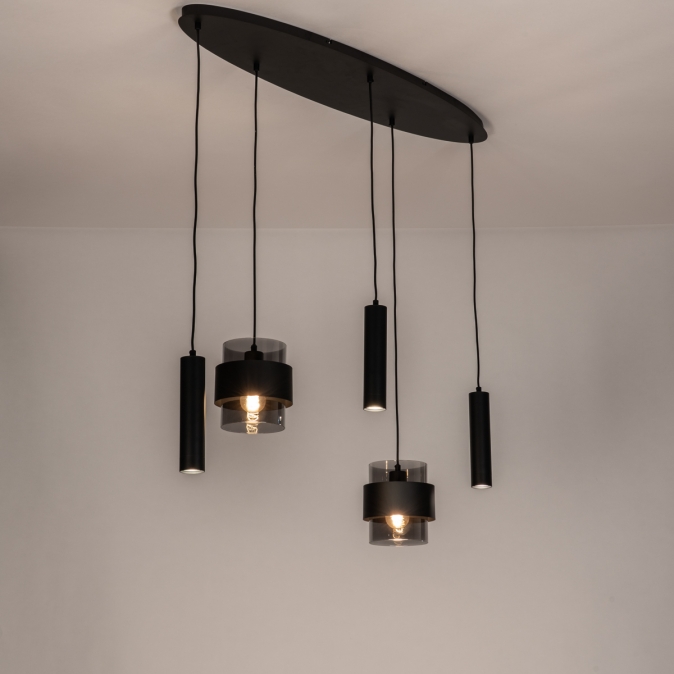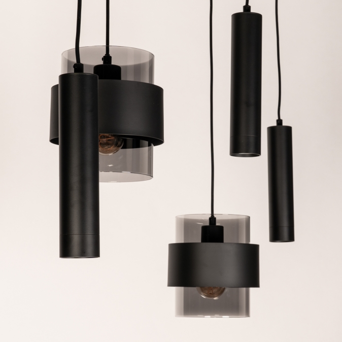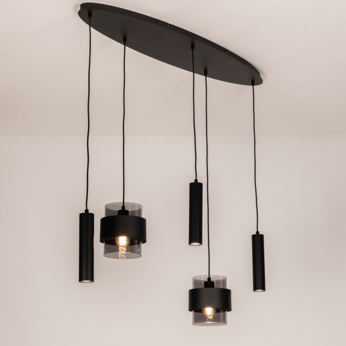 Deze zwarte hanglamp is voorzien van vijf lichtpunten aan een fraaie, ovale plafondplaat; twee glazen kappen en drie lichtkokers met daarin een spot. Elke glazen kap is uitgevoerd in rookglas, gecombineerd met zwarte details. De drie kokers zijn volledig uitgevoerd in de mat zwarte kleur en de spots liggen wat dieper verzonken. De spots geven een prachtige verlichting op de tafel of het werkblad terwijl de twee glazen juist het licht sfeervol rondom uitstralen. Een geweldige combinatie van zowel functioneel als sfeervol licht! De twee glazen zijn uitgevoerd in rookglas. Rookglas heeft een zwart / grijze tint maar is toch transparant en zorgt voor sfeervol licht. Over de mooie, glazen kokers is een zwarte, matte ring geplaatst.Voordelen zwarte hanglamp van glas