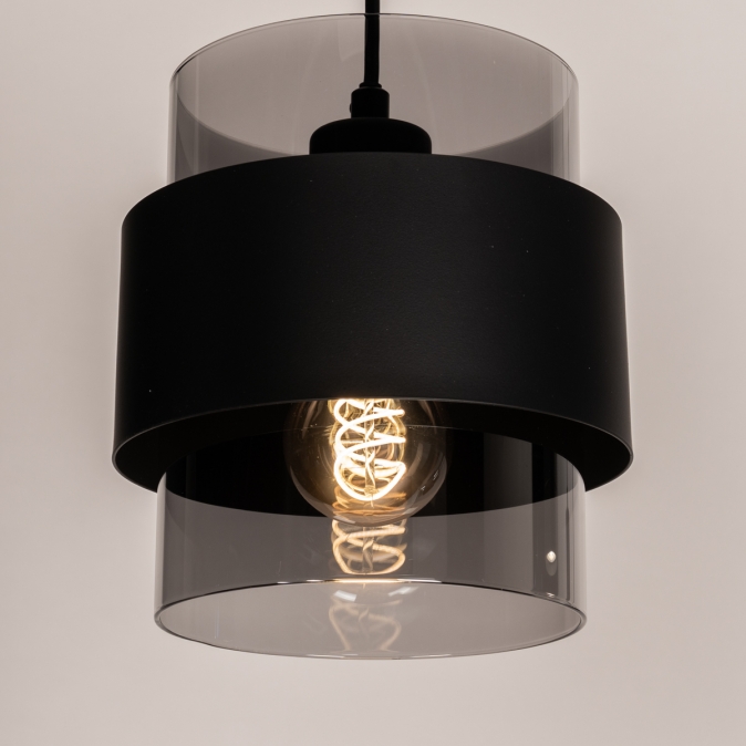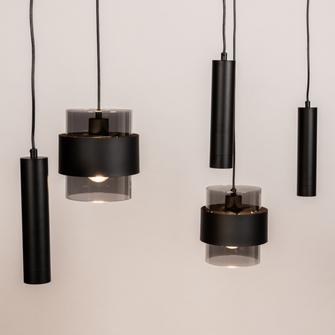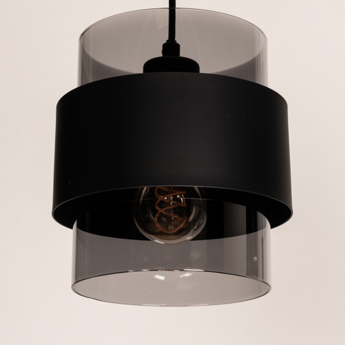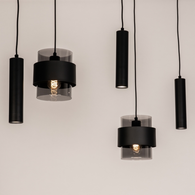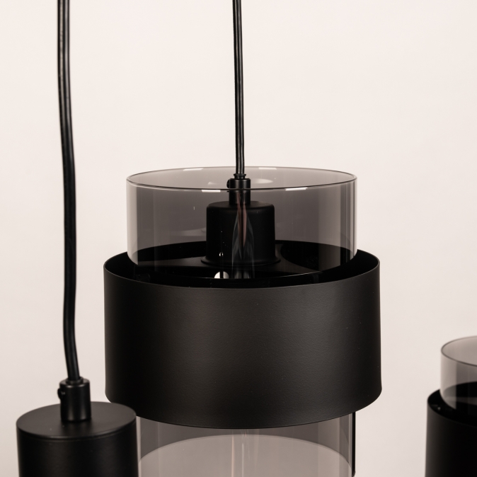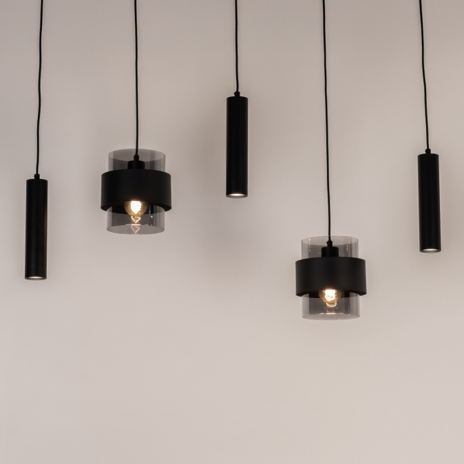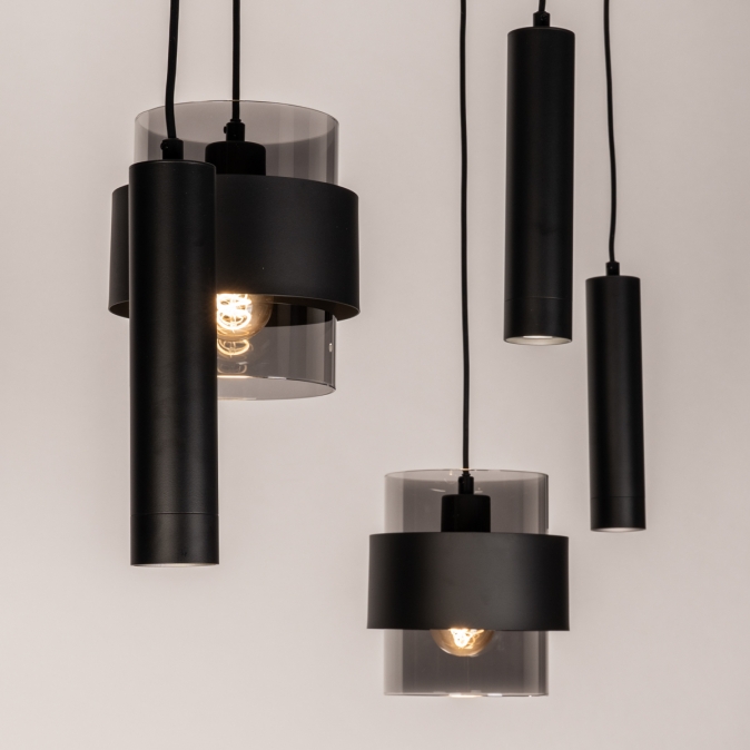 Deze zwarte hanglamp is voorzien van vijf lichtpunten aan een fraaie, ovale plafondplaat; twee glazen kappen en drie lichtkokers met daarin een spot. Elke glazen kap is uitgevoerd in rookglas, gecombineerd met zwarte details. De drie kokers zijn volledig uitgevoerd in de mat zwarte kleur en de spots liggen wat dieper verzonken. De spots geven een prachtige verlichting op de tafel of het werkblad terwijl de twee glazen juist het licht sfeervol rondom uitstralen. Een geweldige combinatie van zowel functioneel als sfeervol licht! De twee glazen zijn uitgevoerd in rookglas. Rookglas heeft een zwart / grijze tint maar is toch transparant en zorgt voor sfeervol licht. Over de mooie, glazen kokers is een zwarte, matte ring geplaatst.Voordelen zwarte hanglamp van glas