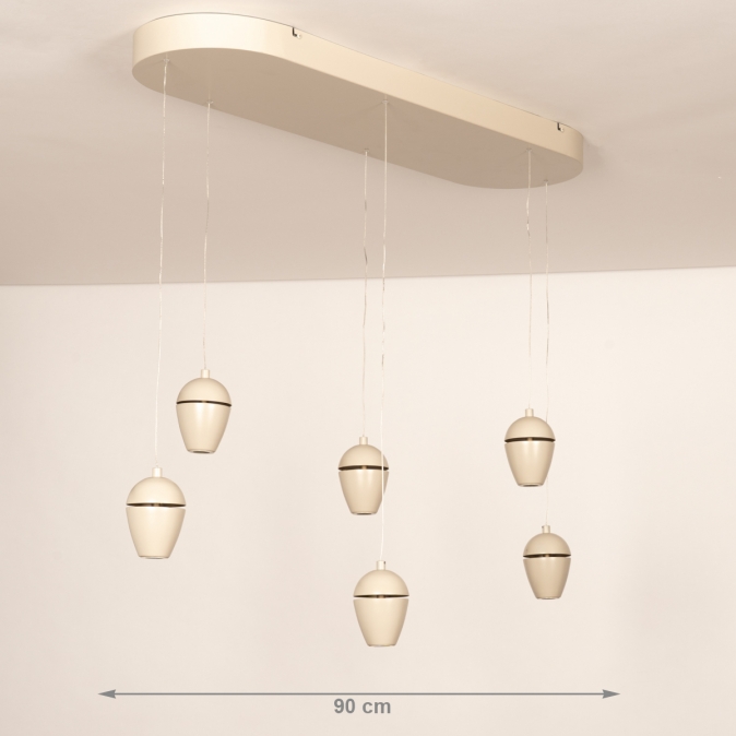 Beige hanglamp, voorzien van zes lichtpunten in een unieke vormgeving, voorzien van een easy lift systeem