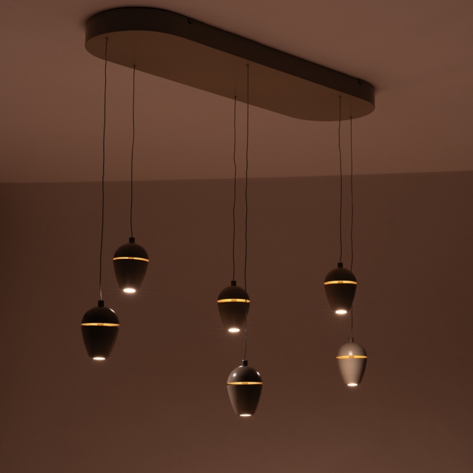 Deze beige hanglamp valt op door zijn ronde, vloeiende vormgeving. Het unieke design bestaat uit een langwerpige plafondplaat met afgeronde hoeken, met daaraan zes bollen die die taps toelopen naar onderen. Aan de onderzijde ligt de lichtbron verzonken. Halverwege de bol is een subtiele dwarsdoorsnede zichtbaar. De binnenzijde heeft een zachte champagnekleur welke zichtbaar wordt zodra de lamp wordt ingeschakeld. Deze lamp is voorzien van een easy lift systeem en is dus in hoogte verstelbaar. Je kunt elke bol afzonderlijk oplichten en omhoog of omlaag te bewegen. Zo kun je de vormgeving steeds naar wens aanpassen. Dit verrassende model is zeer geschikt voor vele doeleinden; bijvoorbeeld boven een eettafel, bureau of keukenblad; de mogelijkheden zijn eindeloos!Voordelen beige hanglamp