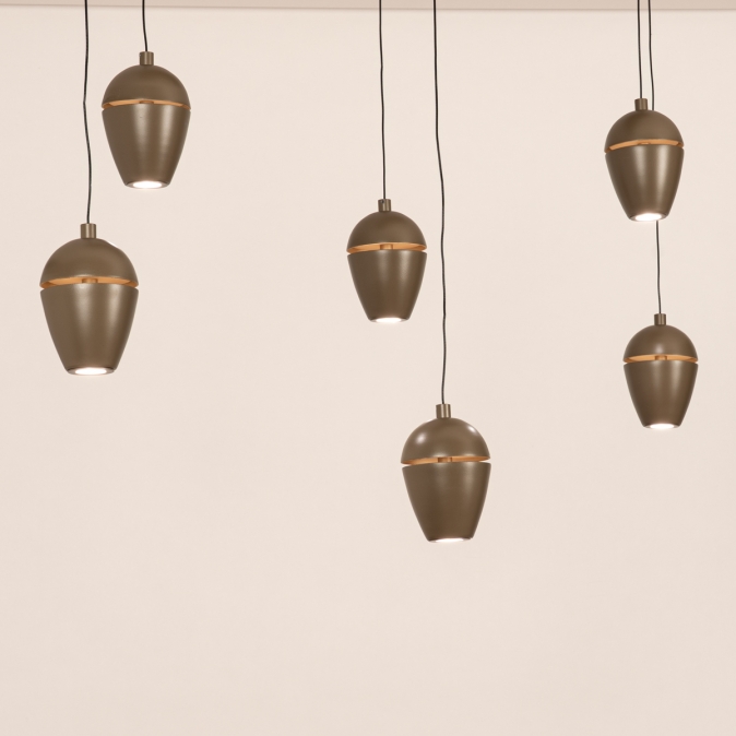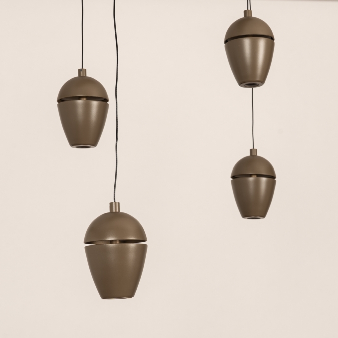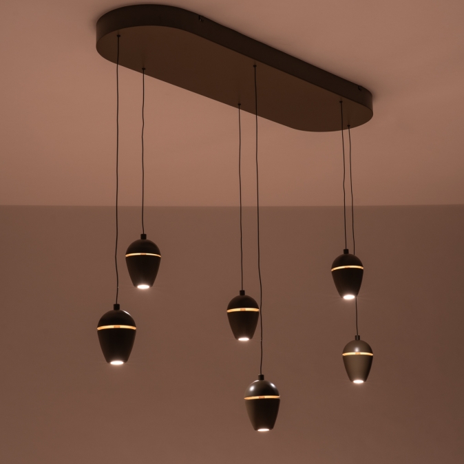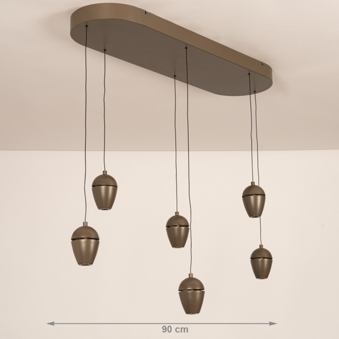 Bruine hanglamp, voorzien van zes lichtpunten in een unieke vormgeving, voorzien van een easy lift systeem
