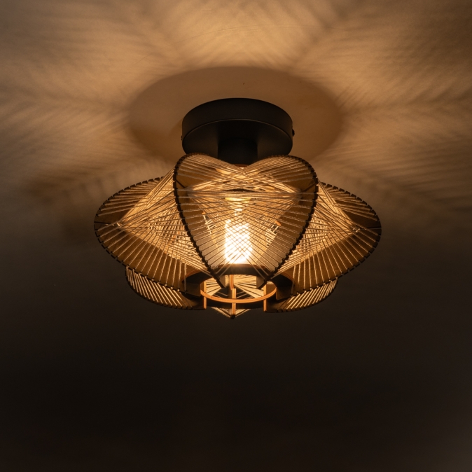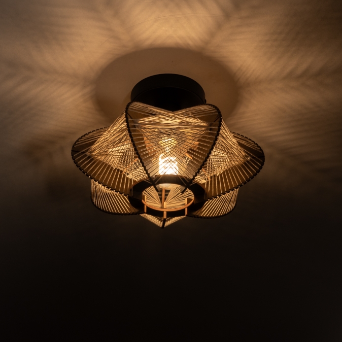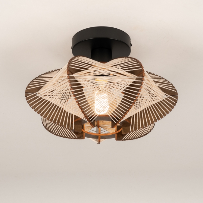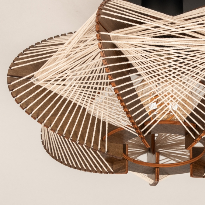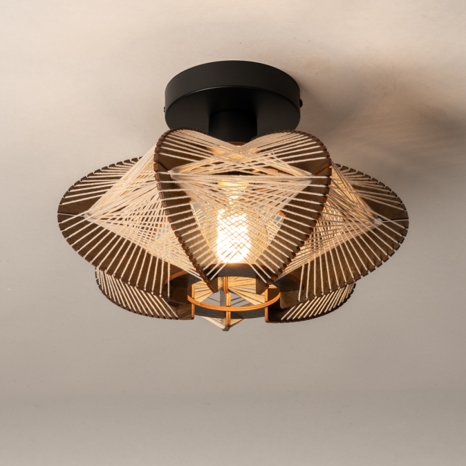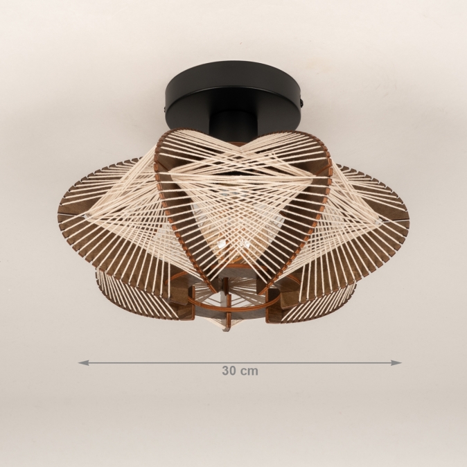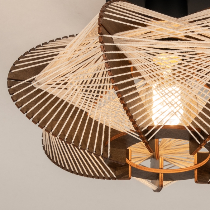 Landelijke Japandi plafondlamp gemaakt van walnoot hout en beige touw