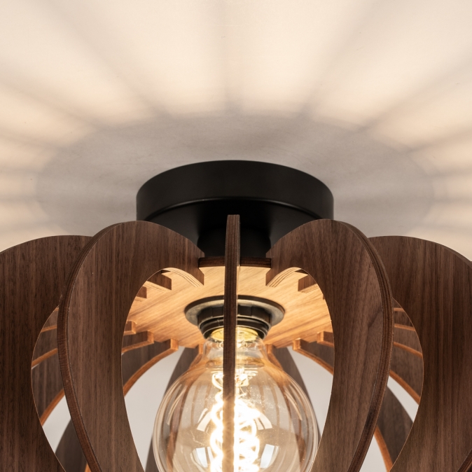 Deze japandi plafondlamp is gemaakt van hout dat een prachtige walnoot kleur heeft. De lamp bestaat uit houten lamellen. Deze lamellen worden stuk voor stuk in twee houten ringen geschoven waardoor een driedimensionale patroon ontstaat.Voordelen donker houten plafondlamp rond