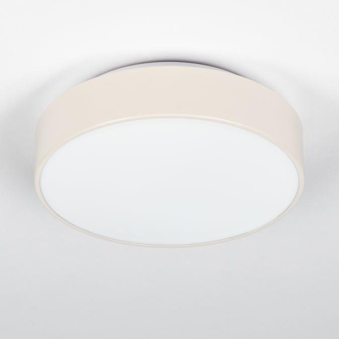 Ronde, beige plafondlamp met wit glas