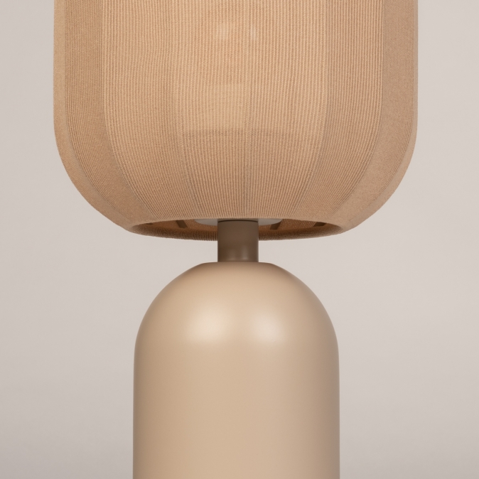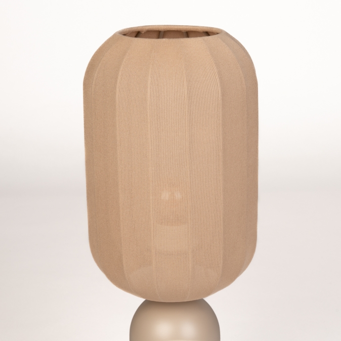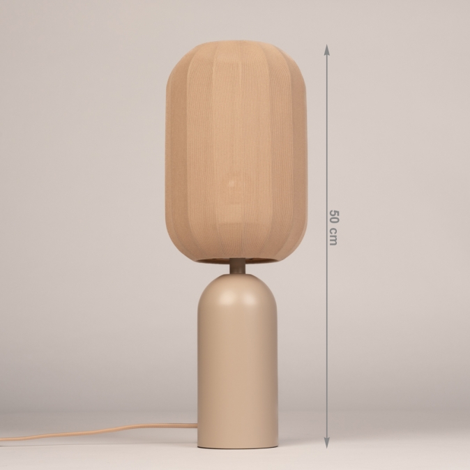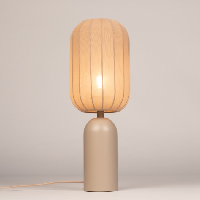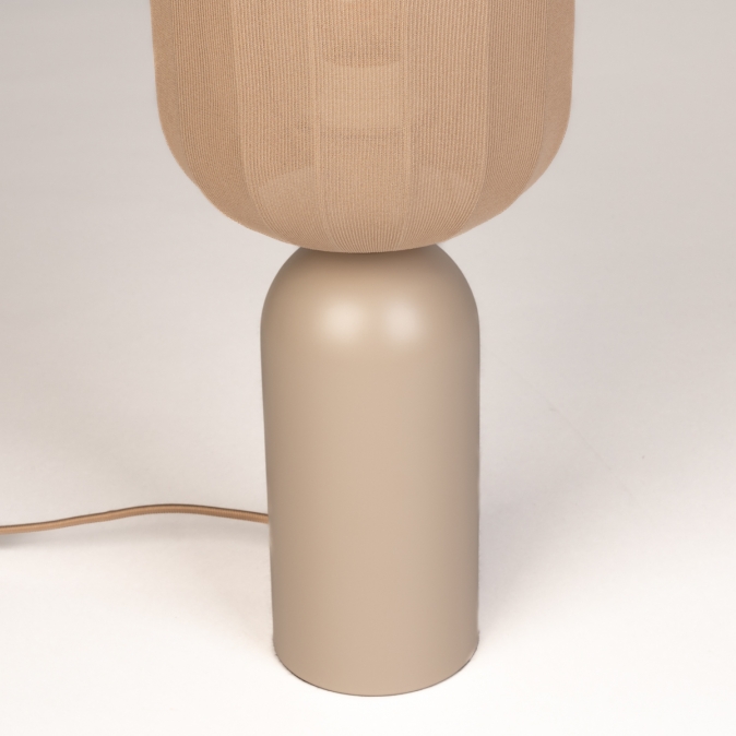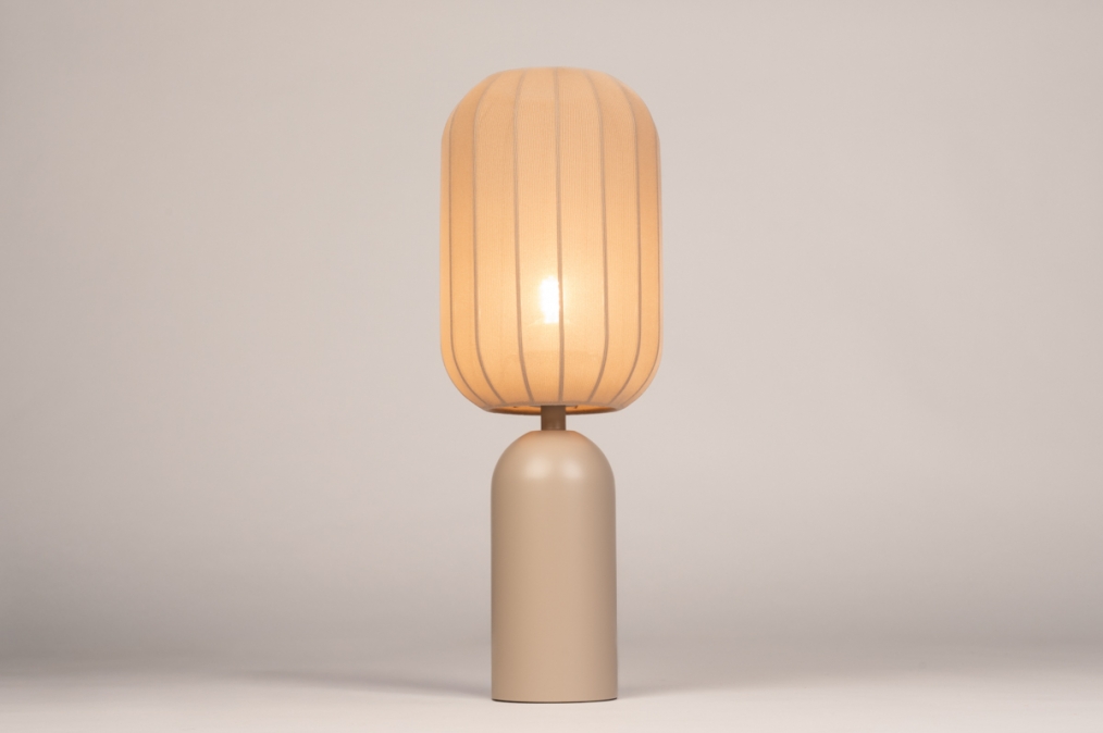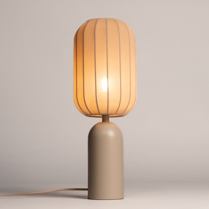 Taupekleurige, smalle tafellamp met langwerpige lampion kap