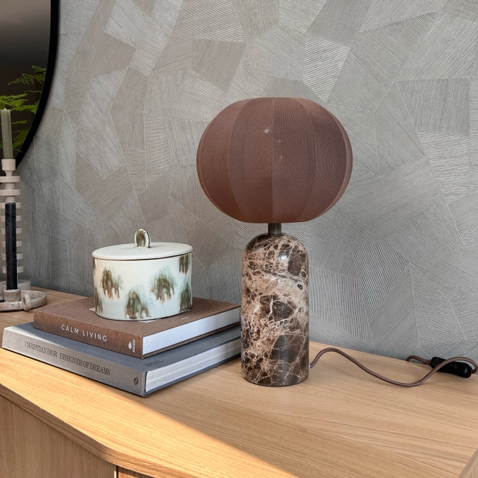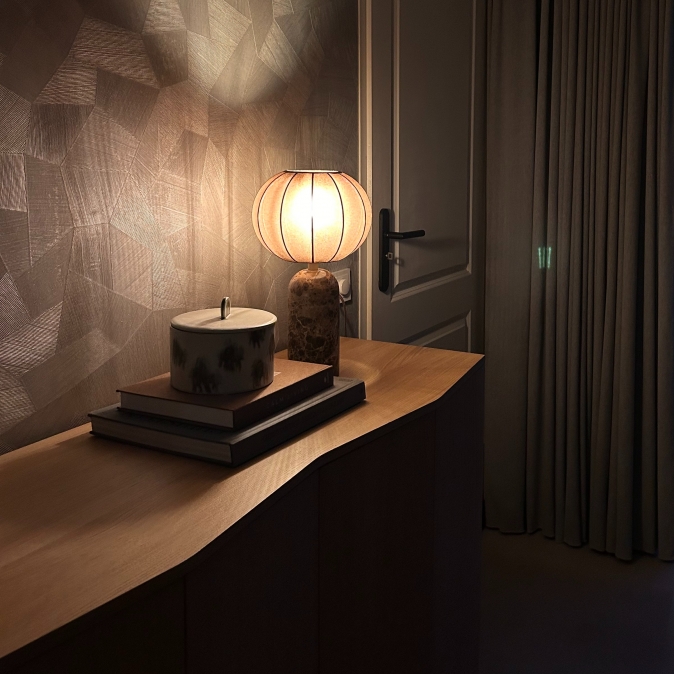 De lamp combineert een luxe, marmeren voet in een warme, bruine kleur met een verfijnde, doorschijnende kap in een ronde lampion vorm. De warme, bruine kleur van de kap zorgt voor een fijne, sfeervolle verlichting. Perfect voor op je nachtkastje, bureau of in een gezellige hoek! Deze lampen zie je veel in trendy woonstijlen zoals Japandi en de Scandinavische woonstijl. Ze laten zich goed combineren met vele materiaalsoorten en kleuren.Voordelen tafellamp met luxe kap