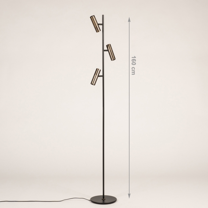 Deze zwarte staande lamp combineert functionaliteit met stijl. Het minimalistische design straalt elegantie uit en door de drie lichtpunten straalt het licht van deze vloerlamp verschillende kanten op. Welke kant? Dat bepaalt u zelf. Want de smalle bronzen kokers -die voor strakke lichtbundels zorgen- zijn draaibaar en kantelbaar. En over functioneel gesproken: elke koker heeft een eigen schakelaar. Deze is te vinden aan de bovenkant van de kokers. Zo zijn de drie kokers los van elkaar aan en uit te zetten. Mooi detail: de schakelaars liggen iets verzonken, waardoor ze niet zichtbaar zijn. Zo houdt de zwart met gouden vloerlamp zijn minimalistische design.Voordelen Koker vloerlamp in zwart met brons