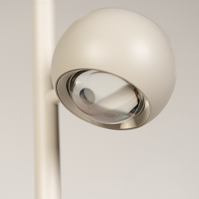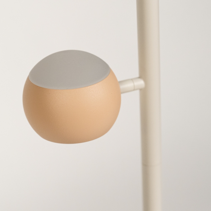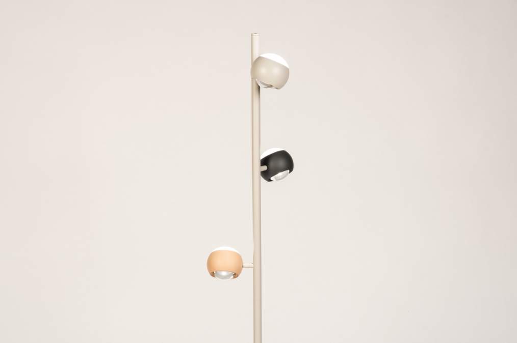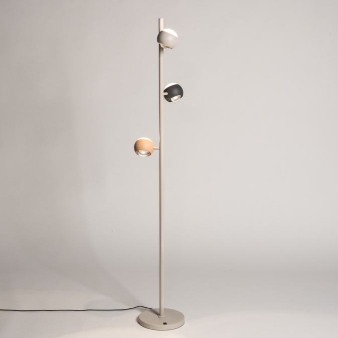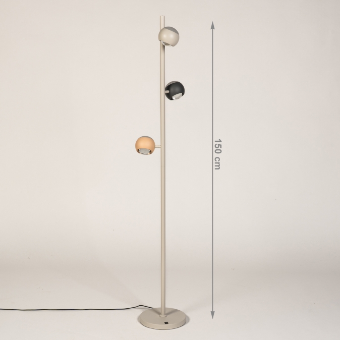 Stijlvolle beige vloerlamp met drie bollen in verschillende kleuren