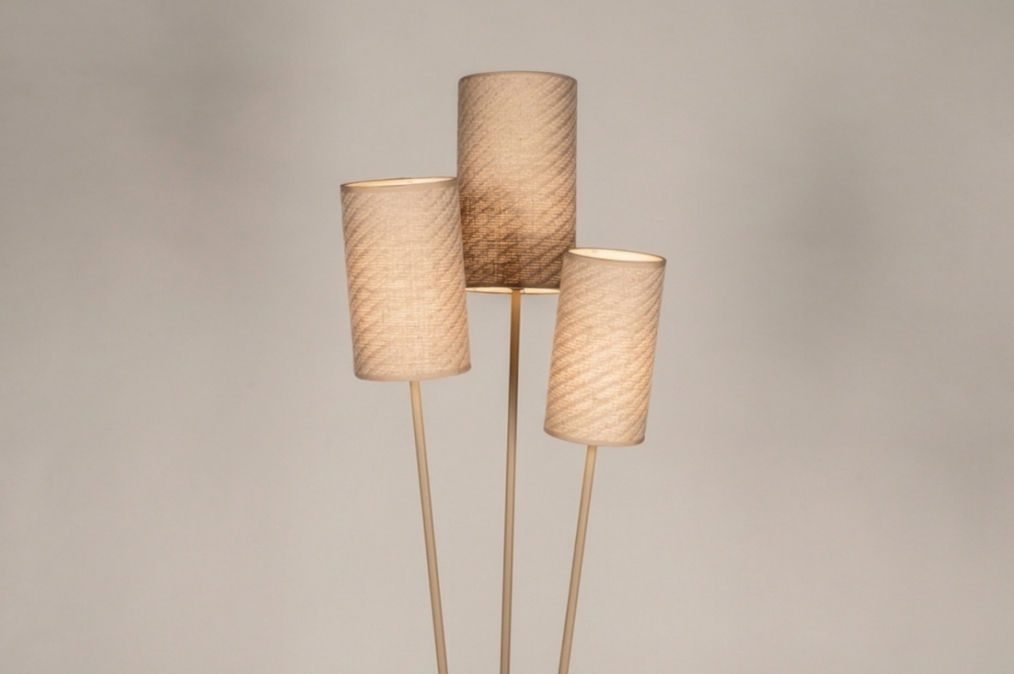 Deze vloerlamp straalt rust en elegantie uit en combineert design en functionaliteit op een prachtige manier. Met zijn warme beigetinten brengt hij direct sfeer in huis. De drie kappen hebben een zichtbare natuurlijke structuur en lijken gemaakt van jute of touw. Dit is op de detailfoto's goed te zien. Deze lamp oogt sereen en zacht. Hierdoor laat hij zich goed plaatsen in vele ruimtes in huis; de hal, naast de bank of of zelfs op een babykamer! Deze lamp brengt sfeer overal!Voordelen van de 3-lichts vloerlamp beige