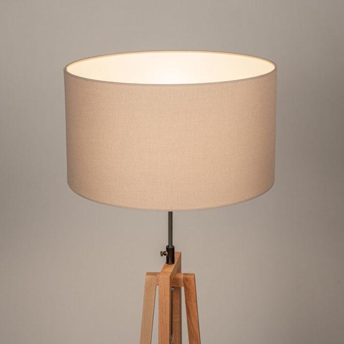 Een elegante vloerlamp met houten poten. Het hout heeft een eiken kleur en is populair in elke woonstijl. Naast de mooie vormgeving en het natuurlijke materiaal, heeft de lamp nog meer te bieden. Zo zit de schakelaar op een heel handige plek; op de zwarte fitting van de lamp. Omdat de schakelaar op een makkelijke plek zit, is de lamp zo aan- of uit gezet, zonder de schakelaar aan het snoer onder de bank te moeten zoeken. Bijzonder: door de verstelbare schroef kan de kap in hoogte worden versteld.Voordelen houten tripod vloerlamp met taupe linnen kap