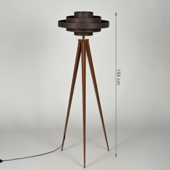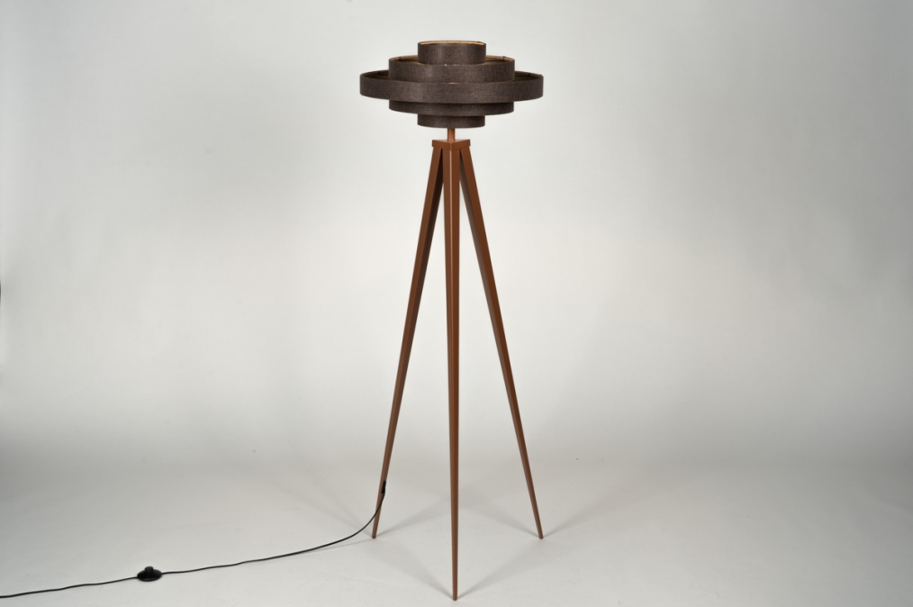Driepoot vloerlamp in trendkleur terracotta, gecombineerd met een bruine kap
