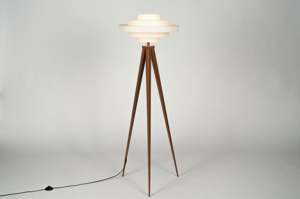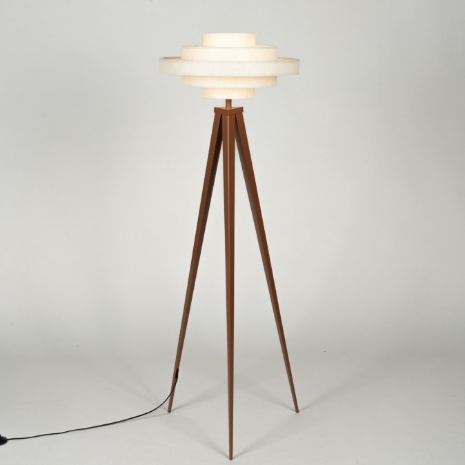 Deze staande lamp valt op door de minimalistische en strakke vormgeving. De lamp heeft drie ranke poten van metaal die taps toelopen. De kleur van deze staande lamp is een trendkleur en wordt Terracotta genoemd, maar kan ook als roestbruin worden gezien. Het is een prachtige rijke kleur die warmte toevoegt aan ieder interieur. We zien de terracotta kleur terug in klassieke en landelijke interieurs en in de Japandi woonstijl. Terracotta, of roestbruin, combineert mooi met aardetinten/natuurtinten. De vloerlamp wordt geleverd met een stoffen beige kap. Deze stoffen kap bestaat uit meerdere ringen waar het licht gezellig doorheen schijnt. Het open karakter van de kap zorgt voor een fraaie verdeling van het lichtVoordelen Tripod vloerlamp