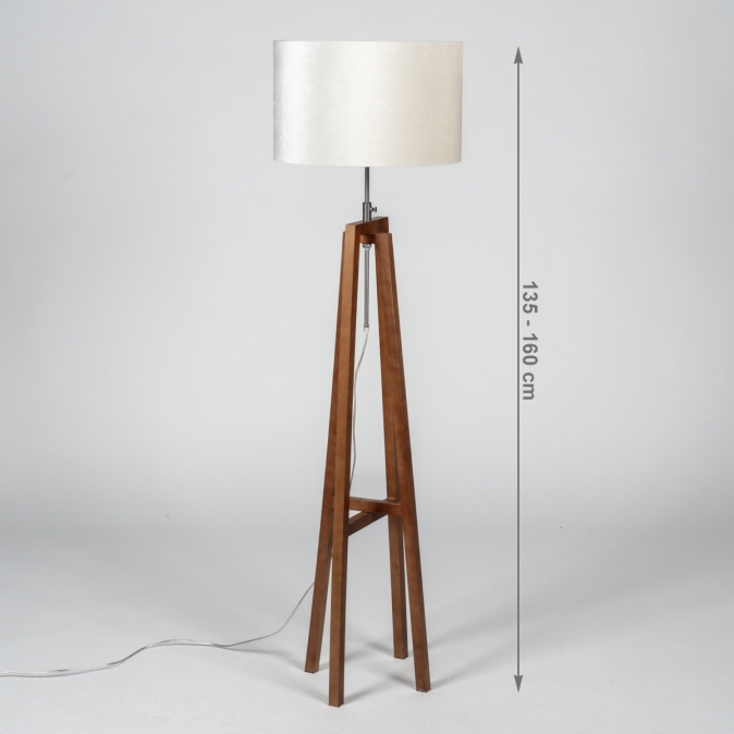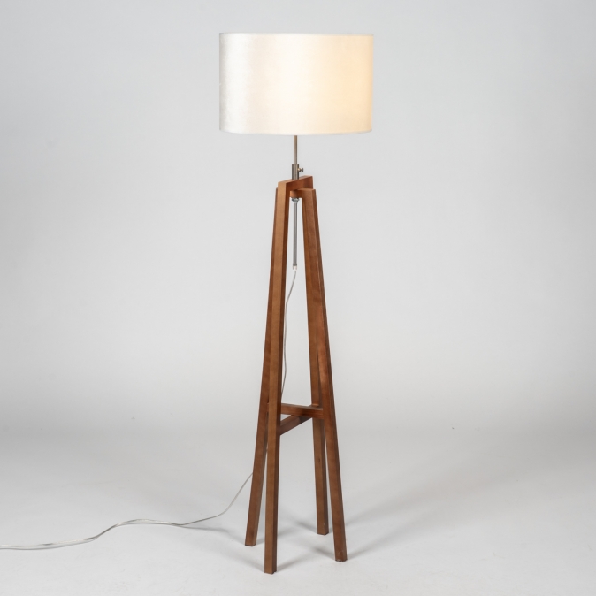 Prachtige houten poten als onderstel voor een vloerlamp. Het hout heeft een mooie warme kleur. We zien dit materiaal terug in klassieke en landelijke woonstijlen. Naast de mooie vormgeving en het natuurlijke materiaal, heeft de lamp nog meer te bieden. Zo zit de aan/uit schakelaar op een heel handige plek; op de zwarte fitting van de lamp. Omdat de schakelaar op een makkelijke plek zit, is de lamp zo aan of uit gezet, zonder de schakelaar aan het snoer onder de bank te moeten zoeken. De vloerlamp wordt geleverd met een beige kap. Deze lampenkap is bekleed met fluweel in een warme beige tint; perfect voor wie houdt van een verfijnde, rustige sfeer in huis. De binnenkant is uitgevoerd in bijpassend beige, wat zorgt voor een stijlvolle ton-sur-ton look en zacht, sfeervol licht. Bijzonder: De kap kan eenvoudig in hoogte worden versteld door de verstelbare schroef.Voordelen Tripod lamp