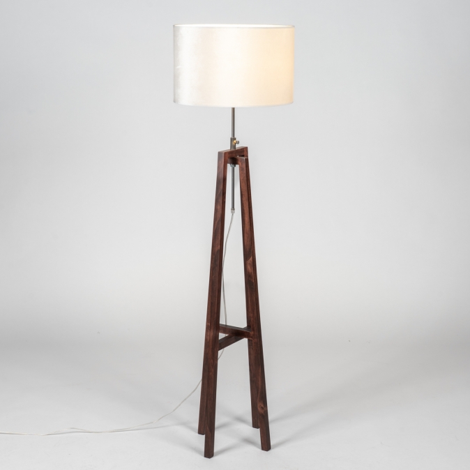 Prachtige houten poten als onderstel voor een vloerlamp. Het hout is prachtig walnoot bruin en is vrij donker van kleur. Naast de mooie vormgeving en het natuurlijke materiaal, heeft de lamp nog meer te bieden. Zo zit de aan/uit schakelaar op een heel handige plek; op de zwarte fitting van de lamp. Omdat de schakelaar op een makkelijke plek zit, is de lamp zo aan of uit gezet, zonder de schakelaar aan het snoer onder de bank te moeten zoeken. De vloerlamp wordt geleverd met een beige kap. Deze lampenkap is bekleed met fluweel in een warme beige tint; perfect voor wie houdt van een verfijnde, rustige sfeer in huis. De binnenkant is uitgevoerd in bijpassend beige, wat zorgt voor een stijlvolle ton-sur-ton look en zacht, sfeervol licht. Bijzonder: De kap kan eenvoudig in hoogte worden versteld door de verstelbare schroef.Voordelen Tripod lamp