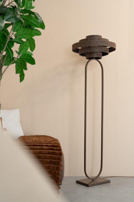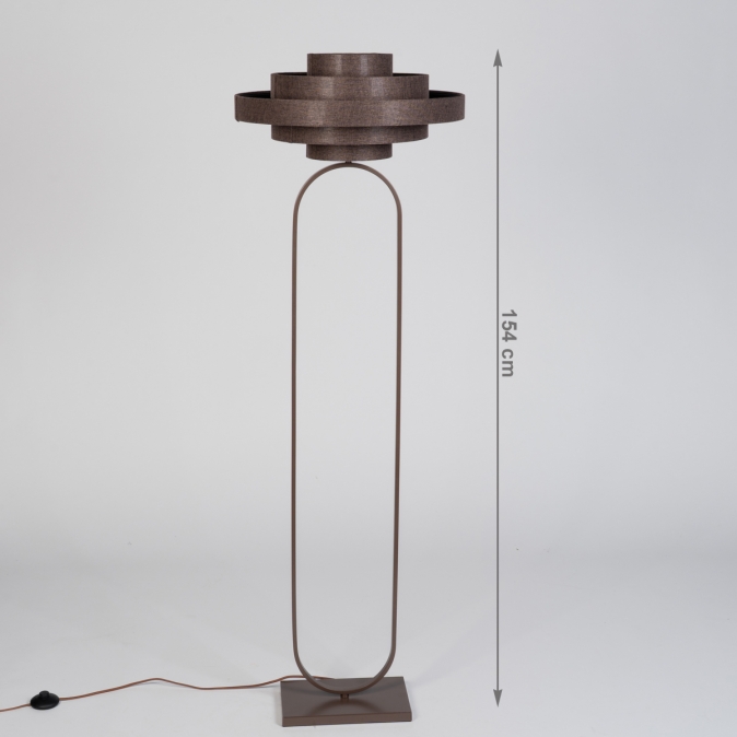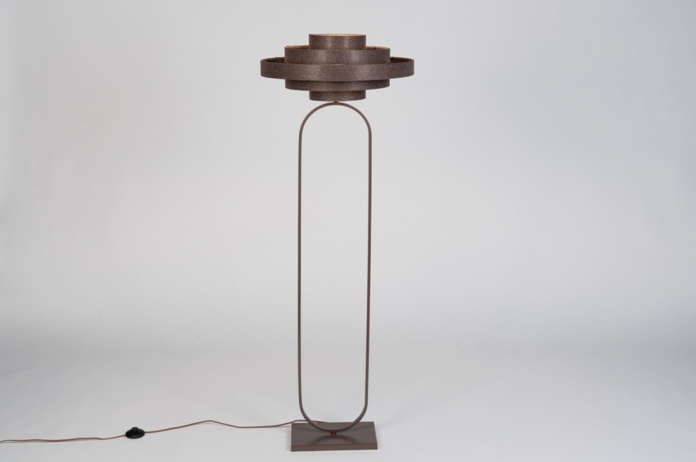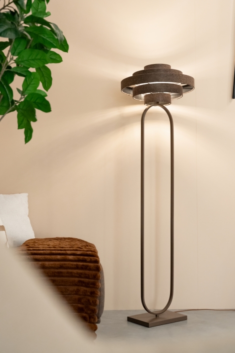 De ronde kap bestaat uit vijf ringen in verschillende formaten waardoor het licht mooi tussen de ringen door schijnt. De doorsnede is 50cm, de bruine kap heeft een grove, stof structuur wat extra sfeer en karakter geeft.Pluspunten van deze vloerlamp: