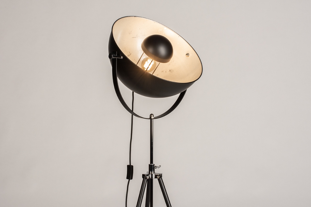 Breng sfeer in huis met deze prachtige driepoot vloerlamp. De binnenkant van de grote zwarte kap is zilverkleurig. Dat zorgt voor een sprankelend licht effect en maakt de lamp chique. De lamp heeft chromen details. Het onderstel bestaat uit drie statiefpoten. De hoogte van de vloerlamp is hierdoor eenvoudig zelf in te stellen. Zelfs de kap is in hoogte verstelbaar. Handig!Voordelen zwart met zilveren vloerlamp