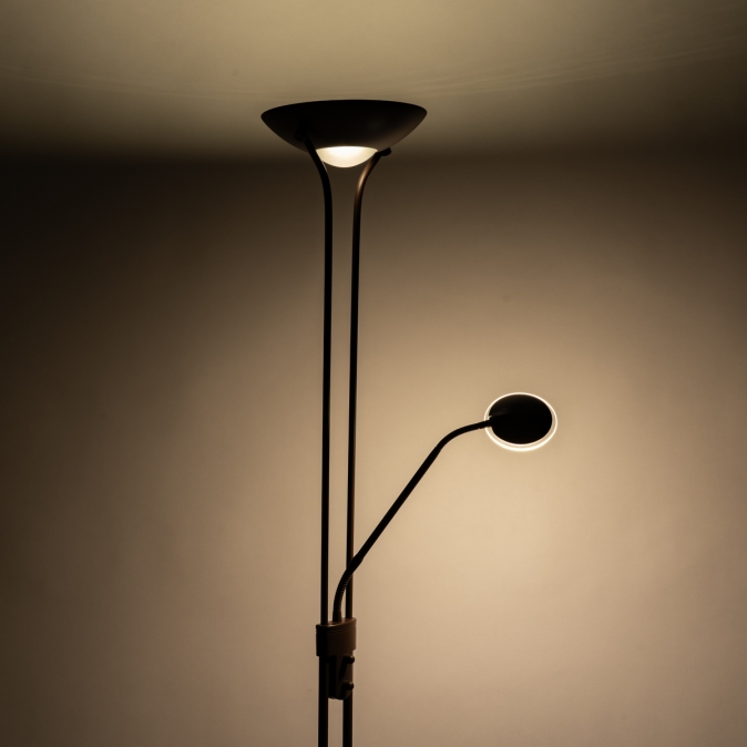 De geïntegreerde led lampen geven niet alleen warm licht, het licht is ook te dimmen. Zo heb je leeslicht of sfeerlicht in een handomdraai. De uplighter heeft een 18 watt led lamp en geeft 1620 lumen licht. Dit kun je vergelijken met (ongeveer) 150 watt gloeilamp licht. De leeslamp geeft 500 lumen licht en verbruikt slechts 5 watt. De lichtopbrengst van de leeslamp kun je vergelijken met (ongeveer) 50 watt gloeilamp licht. De leeslamp is op twee punten te verstellen, zodat je het (lees)licht eenvoudig kunt richten. Zo komt het licht precies daar waar je het hebben wilt.