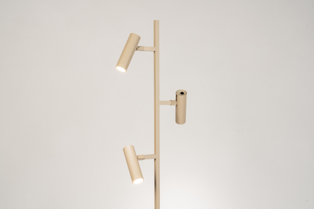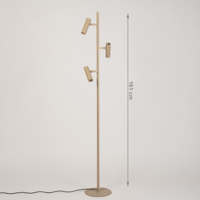 Deze moderne vloerlamp is uitgevoerd in een zachte beige kleur en heeft een strak en minimalistisch ontwerp. De slanke staander en dunne voetplaat zorgen ervoor dat de lamp weinig ruimte inneemt en eenvoudig naast een bank of fauteuil geplaatst kan worden. De lamp is voorzien van drie cilindervormige spots die een gerichte lichtbundel geven dankzij de verdiept liggende mini GU10 lichtbron. Hierdoor is deze lamp perfect te gebruiken als praktische leeslamp of als sfeervolle verlichting in de woonkamer.