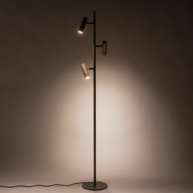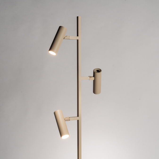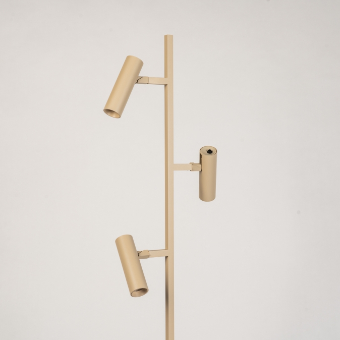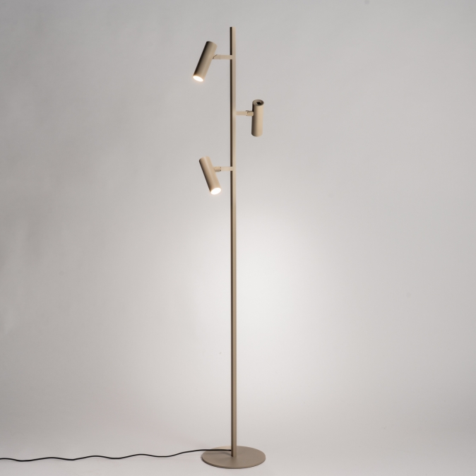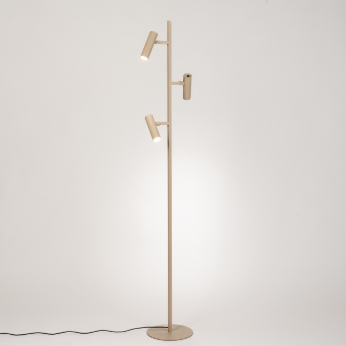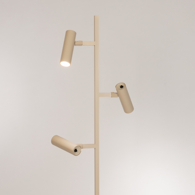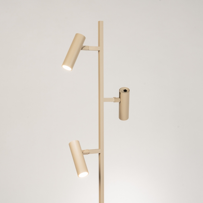 Door het slanke ontwerp en de zachte, beige kleur past deze vloerlamp moeiteloos in vele interieurstijlen. De drie verstelbare spots maken het mogelijk om verschillende delen van de ruimte te verlichten of een comfortabele leesplek te creëren. Dankzij de dunne voetplaat kan de lamp eenvoudig dicht bij een bank of fauteuil worden geplaatst zonder veel ruimte in te nemen.
