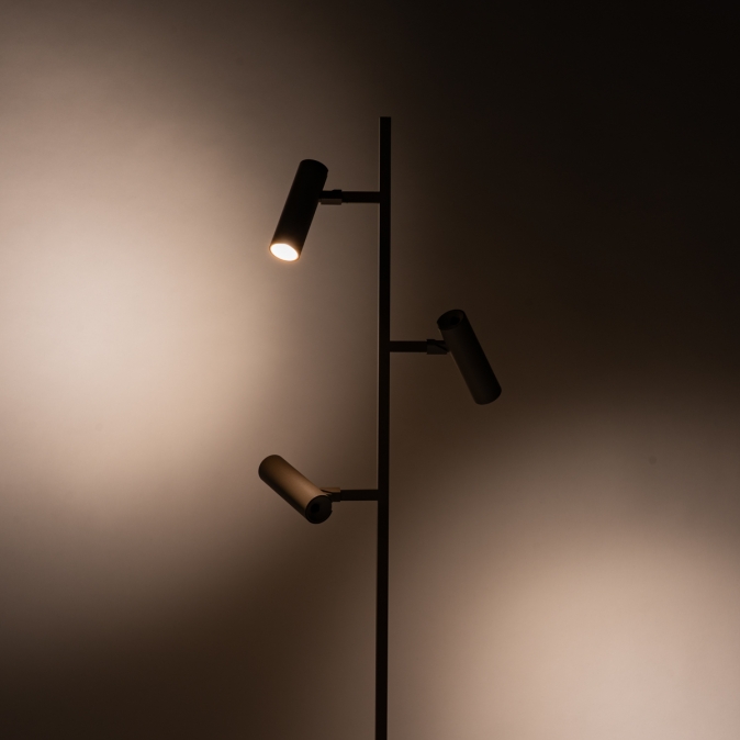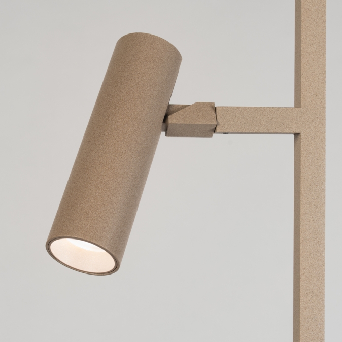 Door het slanke ontwerp en de tijdloze, taupe kleur past deze vloerlamp moeiteloos in vele interieurstijlen. De drie verstelbare spots maken het mogelijk om verschillende delen van de ruimte te verlichten of een comfortabele leesplek te creëren. Dankzij de dunne voetplaat kan de lamp eenvoudig dicht bij een bank of fauteuil worden geplaatst zonder veel ruimte in te nemen.