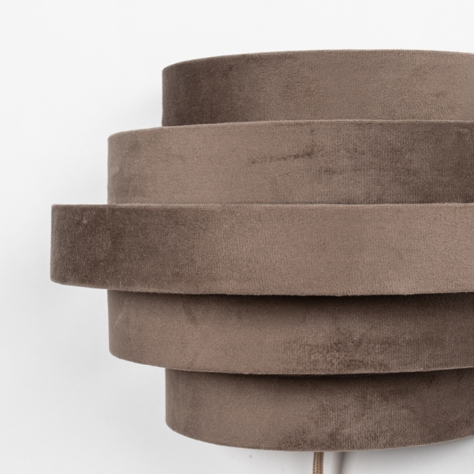 Halfronde wandlamp in zachte, velvet stof uitgevoerd in een grijs bruine kleur
