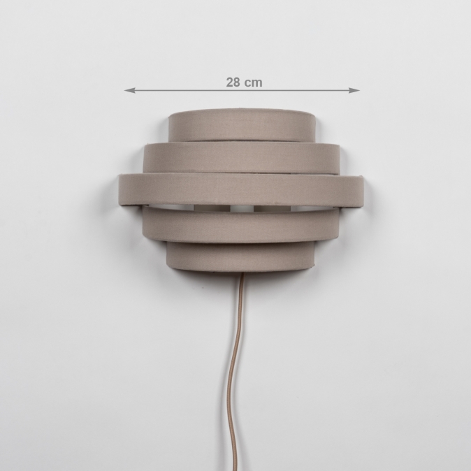 Deze taupe kleurige wandlamp wordt geleverd met snoer en stekker. Het snoer past perfect bij deze wandlamp. Het is ook mogelijk om de wandlamp op een stroompunt in de wand aan te sluiten. In dat geval is het snoer overbodig. De wandlamp heeft een E14 fitting. Door te kiezen voor een dimbare lichtbron is de sfeer gemakkelijk aan te passen aan elk moment. Voor nog meer gemak kiest u voor een led-lamp met drie standen, waarmee het licht in drie stappen kan worden gedimd via de bestaande schakelaar. Altijd de juiste sfeer in huis!Afmetingen