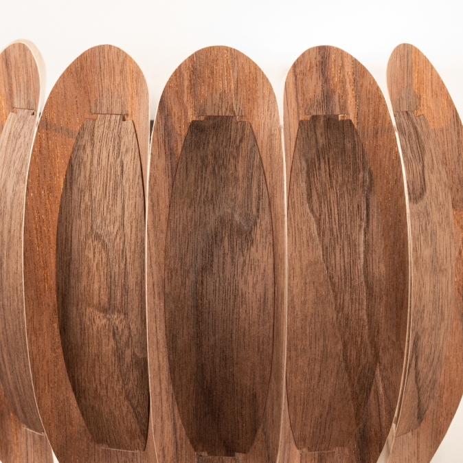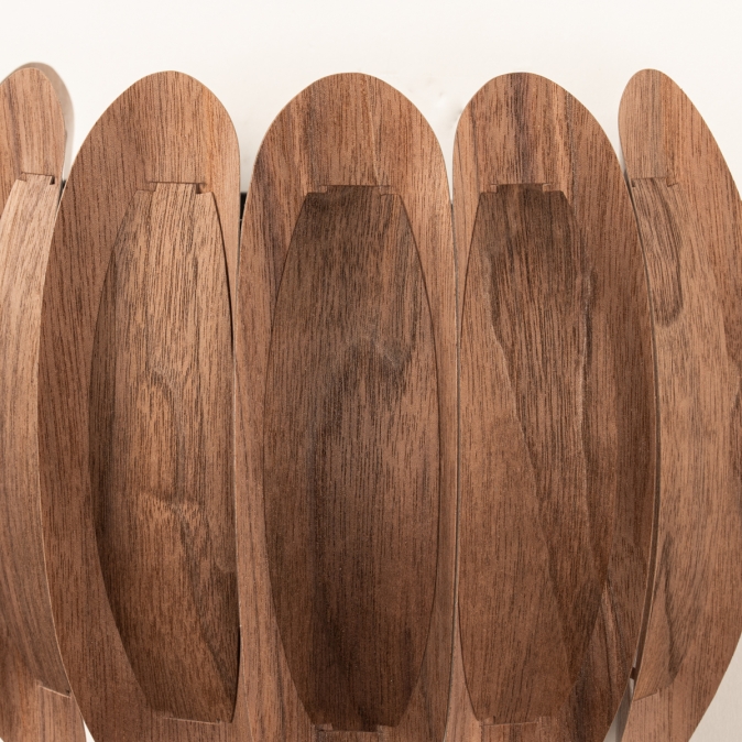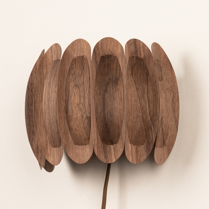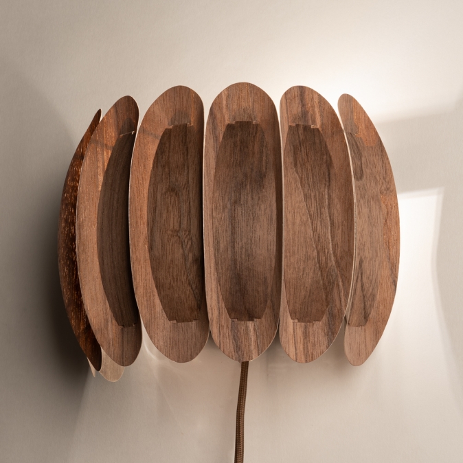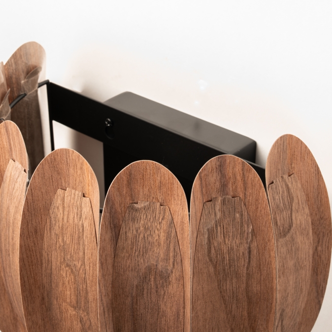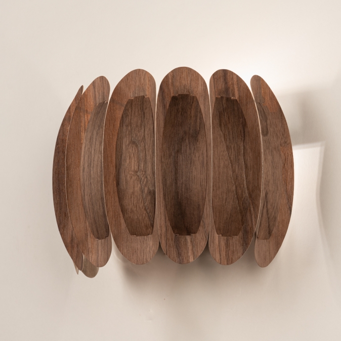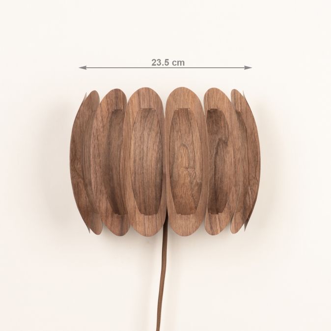 Een topper in ons assortiment! Deze prachtige wandlamp heeft een half ronde vorm en bestaat uit gebogen, houten lamellen die tegen elkaar aan liggen. Aan de binnenzijde de grotere lamellen en aan de buitenzijde de kleinere. Dit creëert een fraai en natuurlijk kleuren patroon in walnoothout.Het unieke ontwerp zorgt voor een een natuurlijke, ontspannen sfeer in menig interieur!
